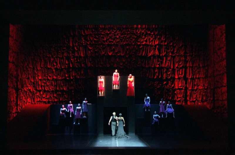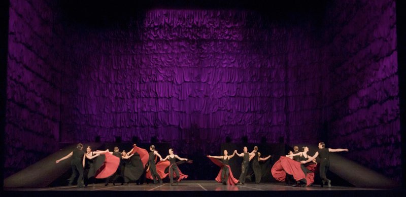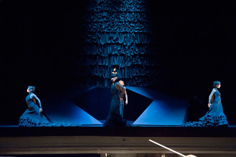 Der riesige, die Opernbühne (Verena Hemmerlein) an allen Seiten bis in den hohen Schnürboden auskleidende Vorhang spendiert der andalusischen Über-Frau viele, sehr viele Rüschen. Es wirkt, als sei der gesamte Raum von einem riesigen Flamenco-Rock umhüllt – ein Bild, das gerade in seiner Übertreibung beeindruckt und zugleich den zwiespältigen Charakter dieser „Carmen“ umfängt. Denn Montero wechselt in den 17 Szenen seines Balletts stets sprunghaft zwischen intimer Psychologisierung und folkloristischen Tableaus, zwischen schwelgerischer Andalusien-Romantik und schroffer emotionaler Dramatik. (…)