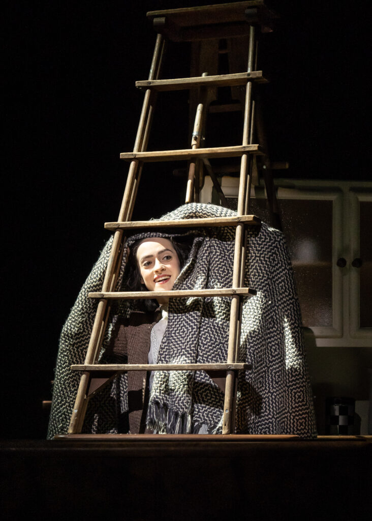 Das Licht stammt von Wim Wermuth. Zusammen mit der Musik von Grigori Fred umspielt es als klug bewegte kubistische Komposition Anne Franks Situation, Gestalt und Geschichte. Für den Abschnitt welchen die junge Frau zwischen 13 und 15 Jahren im Tagebuch festgehalten hat, lassen die Scheinwerfer tausend Facetten aufdämmern aufglänzen, aufstrahlen. Mal stellen sie das Gesicht der Heranwachsenden in dramatische Profilschatten, mal rücken sie es durch die Flüchtigkeit mittelalterlicher Andachtsbilder in eine jenseitige, selbstversunkene Ferne.